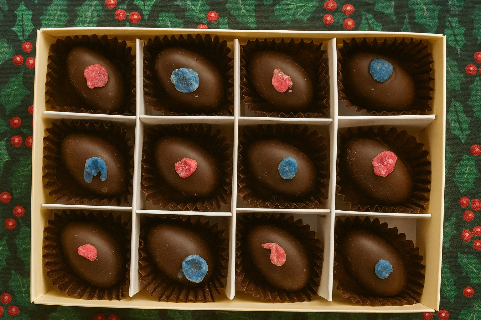 A Christmas classic with an elegant floral twist. Our Rose & Violet Creams pair beautifully fragrant fondant centres with a crisp layer of rich dark chocolate — hand-finished for a touch of seasonal luxury. Delicate, nostalgic and utterly enchanting, they make the perfect gift for someone special (or a well-deserved treat just for you) this Christmas.