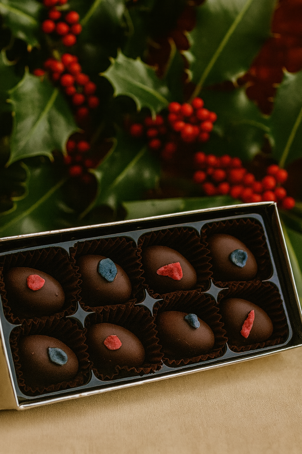 Delicately floral and beautifully festive, these Rose & Violet Creams (8) bring a touch of old-fashioned luxury to the holiday season. Handcrafted in small batches, each soft fondant centre is infused with natural rose or violet essence, then enrobed in rich dark chocolate for a perfectly balanced, melt-in-the-mouth treat.